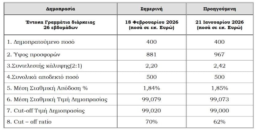 Στο 1,84% (πολύ κοντά στο 1,85% της προηγούμενης δημοπρασίας) διαμορφώθηκε η απόδοση κατά τη σημερινή (Τετάρτη 18 Φεβρουαρίου 2026) δημοπρασία εντόκων γραμματίων διάρκειας 26 εβδομάδων (6 μηνών), ύψους 400 εκατ. ευρώ.