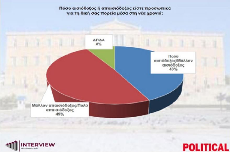 Στο επόμενο ερώτημα, «πόσο αισιόδοξος ή απαισιόδοξος είστε προσωπικά για τη δική σας πορεία μέσα στη νέα χρονιά», μάλλον απαισιόδοξος/πολύ απαισιόδοξος δηλώνει το 49%, πολύ αισιόδοξος/μάλλον αισιόδοξος το 43% και 8% ΔΞ/ΔΑ.