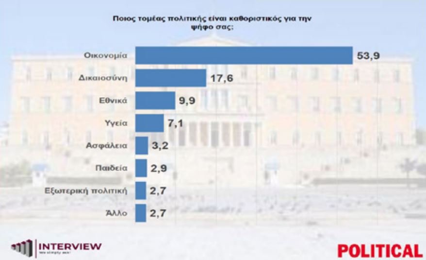 Και σε αυτή τη δημοσκόπηση της Interview, η οικονομία αναδεικνύεται σε καθοριστικότερο παράγοντα για την ψήφο των πολιτών. Συγκεκριμένα, το 53,9% των ερωτηθέντων απαντά η οικονομία και ακολουθούν η δικαιοσύνη με 17,6%, τα εθνικά με 9,9%, η υγεία με 7,1%, η ασφάλεια με 3,2%, η παιδεία με 2,9%, η εξωτερική πολιτική με 2,7% και άλλο με 2,7%.