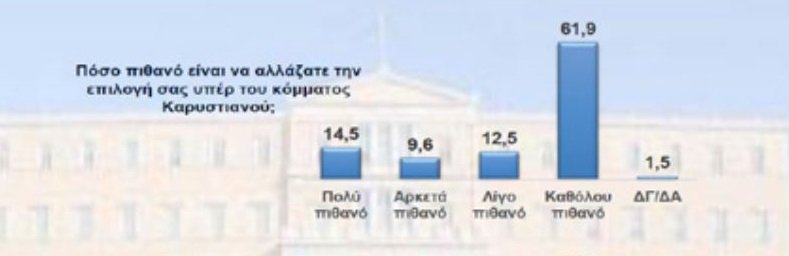 Στην ερώτηση «πόσο πιθανό είναι να αλλάζατε την επιλογή σας υπέρ ενός κόμματος υπό τη Μαρία Καρυστιανού», το 14,5% απαντά πολύ πιθανό, το 9,6% αρκετά πιθανό, το 12,5% λίγο πιθανό, το 61,9% καθόλου πιθανό και 1,5 ΔΞ/ΔΑ.