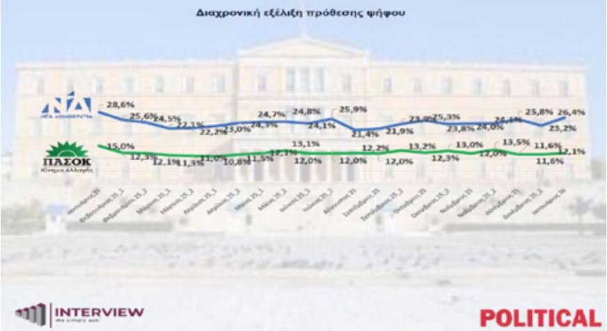 Προβάδισμα 14,3 μονάδων καταγράφει η Νέα Δημοκρατία έναντι του ΠΑΣΟΚ στην πρόθεση ψήφου, σύμφωνα με τη δημοσκόπηση της εταιρείας της Interview για την «Political», η οποία διενεργήθηκε από 9 έως 12 Ιανουαρίου 2026.