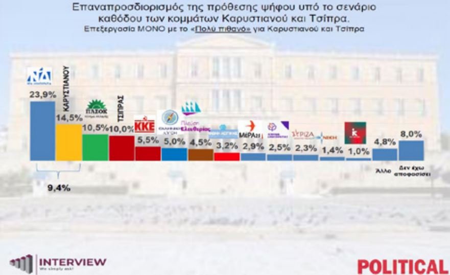Στον επαναπροσδιορισμό της πρόθεσης ψήφου, υπό το σενάριο καθόδου κομμάτων υπό τη Μαρία Καρυστιανού και τον Αλέξη Τσίπρα στη βάση της επεξεργασίας των απαντήσεων μόνον όσων απαντούν ότι είναι πολύ πιθανό να ψηφίσουν Καρυστιανού ή Τσίπρα, τα ποσοστά διαμορφώνονται ως εξής: