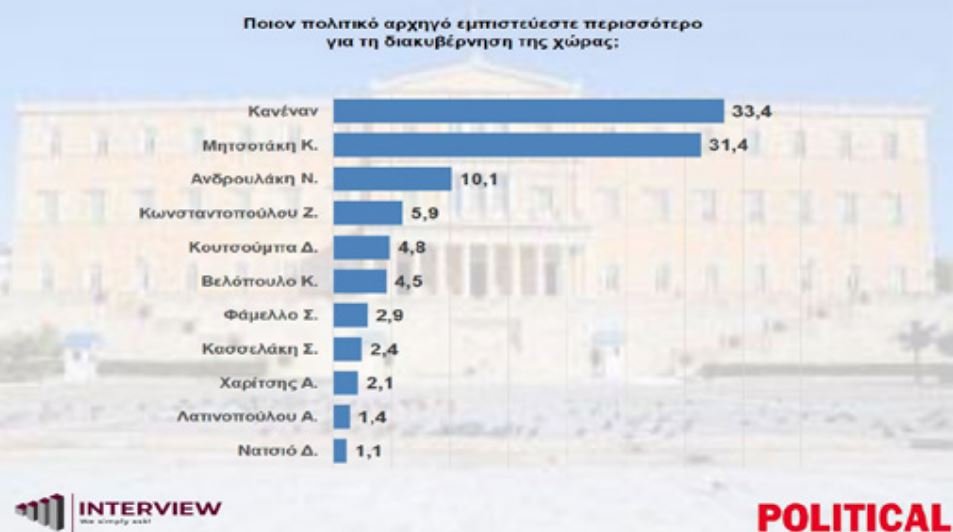 Στην ερώτηση «ποιον πολιτικό αρχηγό εμπιστεύεστε περισσότερο για τη διακυβέρνηση της χώρας», η δημοφιλία του Πρωθυπουργού Κυριάκου Μητσοτάκη εμφανίζεται αυξημένη σε σχέση με την προηγούμενη μέτρηση της Interview. Παράλληλα, επιβεβαιώνεται για μία ακόμη φορά ότι ο Κυριάκος Μητσοτάκης ουσιαστικά δεν έχει αντίπαλο, αφού τα ποσοστά εμπιστοσύνης στο πρόσωπό του είναι τουλάχιστον τριπλάσια σε σχέση με τον επόμενο πολιτικό αρχηγό.