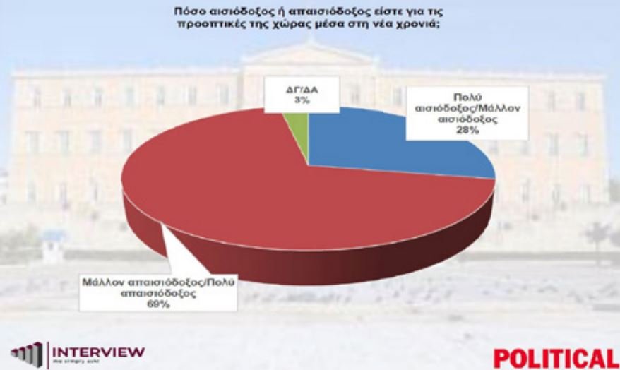 Συγκεκριμένα, στο ερώτημα «πόσο αισιόδοξος ή απαισιόδοξος είστε για τις προοπτικές της χώρας μέσα στη νέα χρονιά», το 69% δηλώνει μάλλον απαισιόδοξος/πολύ απαισιόδοξος, το 28% πολύ αισιόδοξος/μάλλον αισιόδοξος και 3% ΔΞ/ΔΑ.