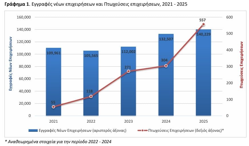Αύξηση όμως καταγράφηκε το 2025 και στις εγγραφές νέων επιχειρήσεων (ενάρξεις λειτουργίας επιχειρήσεων), οι οποίες ανήλθαν σε 140.229, παρουσιάζοντας άνοδο 5,8% σε σχέση με το 2024 (132.507 ενάρξεις).