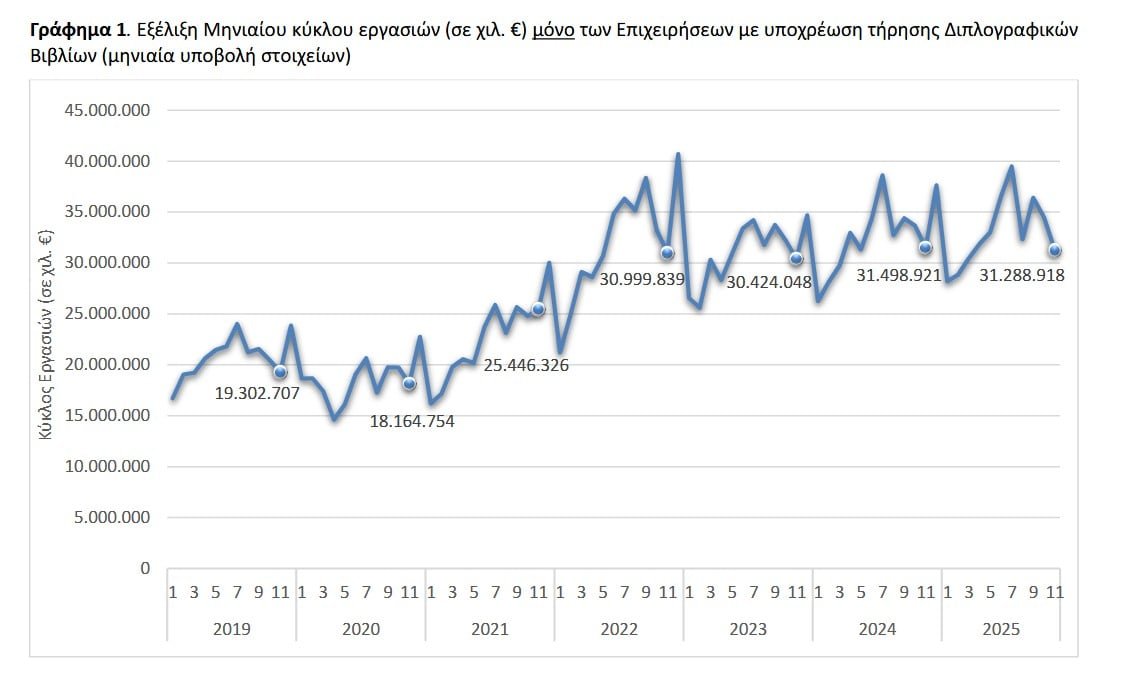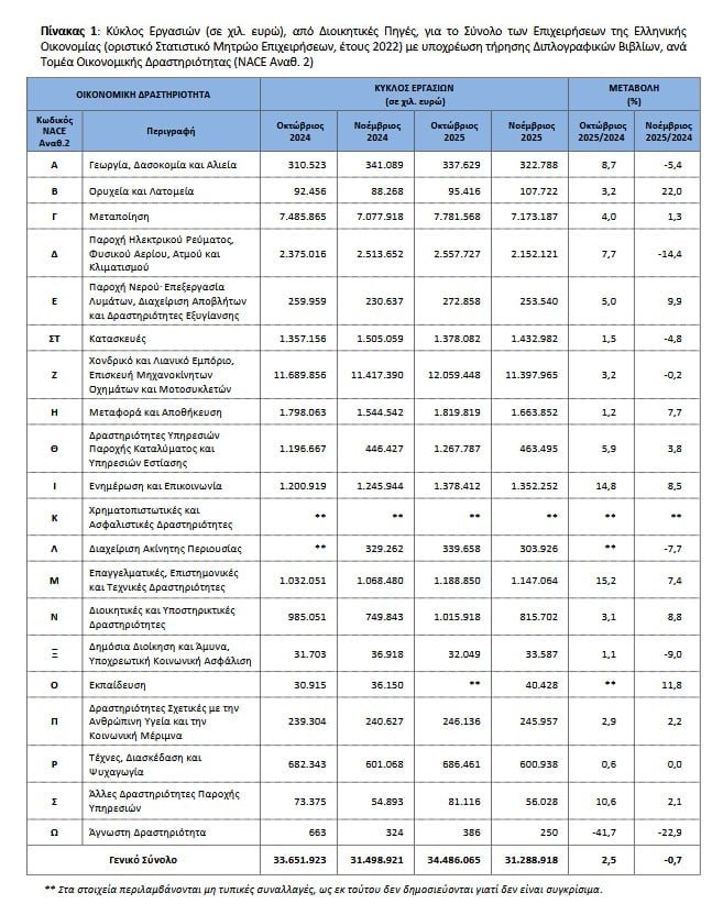 Ειδικότερα, για το σύνολο των επιχειρήσεων και των δραστηριοτήτων της οικονομίας με υποχρέωση τήρησης διπλογραφικών βιβλίων, για τις οποίες υπάρχουν διαθέσιμα στοιχεία σε μηνιαία βάση, ο κύκλος εργασιών τον Νοέμβριο 2025 ανήλθε σε 31,289 δισ. ευρώ σημειώνοντας μείωση 0,7% σε σχέση με τον Νοέμβριο 2024 που είχε διαμορφωθεί στα 31,499 δισ. ευρώ.
