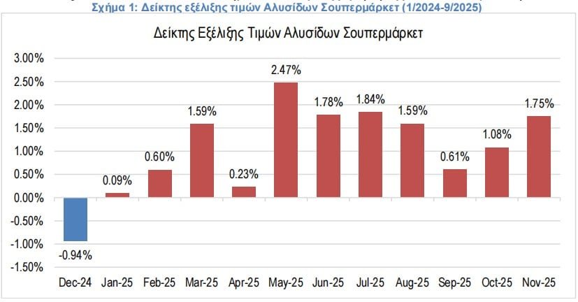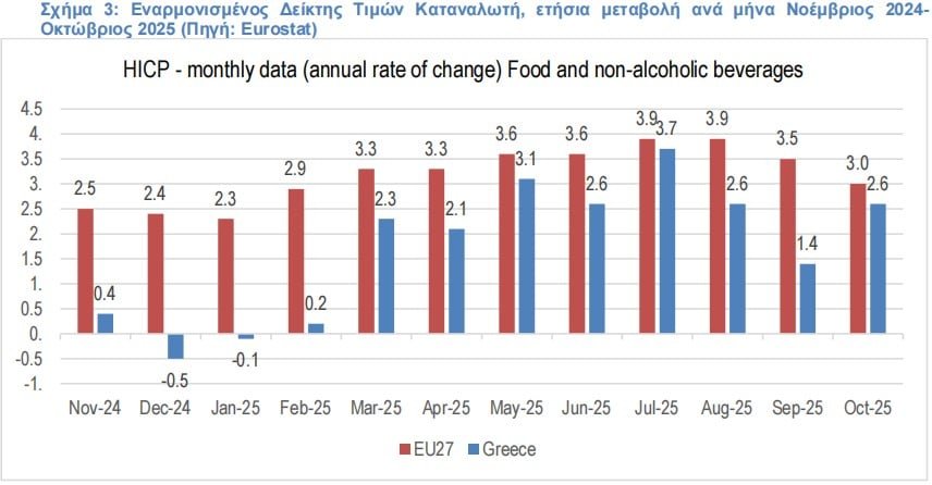 Παράλληλα, όλο το 12μηνο Νοέμβριος 2024-Οκτώβριος 2025, ο εναρμονισμένος δείκτης τροφίμων και μη αλκοολούχων ποτών παρέμεινε χαμηλότερα από τον Ευρωπαϊκό Μέσο, ενώ αρκετούς μήνες η τιμή διέφερε σχεδόν 3 ποσοστιαίες μονάδες.