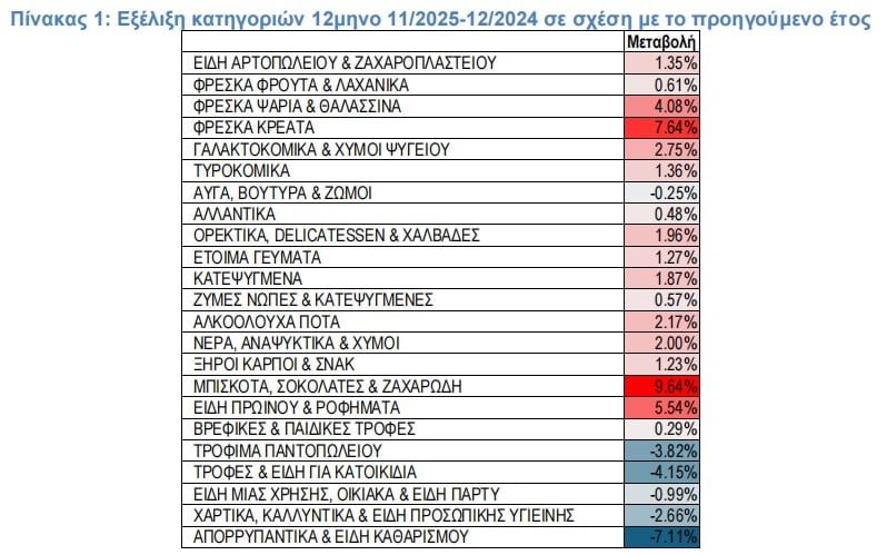 Η σταθερή πορεία που διαπιστώνεται επηρεάζεται από συγκεκριμένες κατηγορίες, με τα είδη παντοπωλείου και τα μη τρόφιμα να καταγράφουν μειώσεις το 2025, ενώ το νωπό κρέας, τα σοκολατοειδή και τα είδη πρωινού να καταγράφουν αυξήσεις.