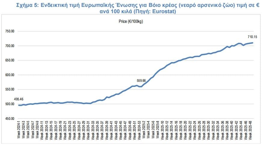 Συγκεκριμένα, από την 1η έως τις 7 Δεκεμβρίου του 2025 η τιμή παραγωγού του βόειου κρέατος για νεαρό αρσενικό ζώο στην Ευρωπαϊκή Ένωση έχει αυξηθεί κατά 27,82% σε σχέση με την ίδια εβδομάδα το 2024 και 43,3% σε σχέση με την αρχή του 2024, ενώ η τάση παραμένει αυξητική.