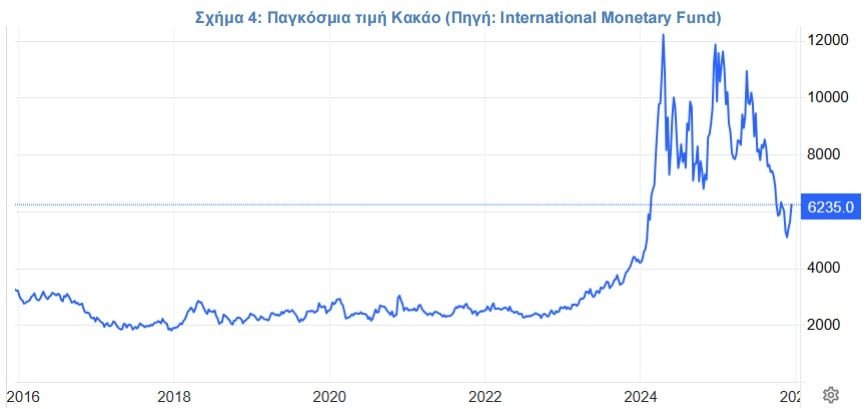 Σε σχέση με την τιμή του κακάο, οι αυξήσεις στις τιμές πρώτων υλών, διεθνώς, της τελευταίας 2ετίας, λόγω των κλιματικών συνθηκών ήταν πολύ υψηλές. Οι τιμές την περίοδο 2015-2024 κυμαίνονταν στο επίπεδο των 3.000 δολαρίων ανά τόνο. Το 2024 εκτινάχθηκαν στις 12.000 δολάρια ανά τόνο, σχεδόν τετραπλασιάστηκαν. Έκτοτε, η τιμή με σημαντικές διακυμάνσεις και σταδιακή μείωση έχει πέσει μεν στο 50% του ανώτατου σημείου, αλλά παραμένει υπερδιπλάσια της τιμής της προηγούμενης δεκαετίας.