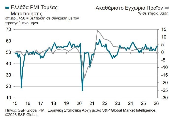 Ο εποχικά προσαρμοσμένος Δείκτης Υπευθύνων Προμηθειών της S&P Global για τον τομέα μεταποίησης στην Ελλάδα (Purchasing Managers’ Index™ – PMI) έκλεισε στις 54.4 μονάδες τον Φεβρουάριο, τιμή ελαφρώς υψηλότερη από τις 54.2 μονάδες στο ξεκίνημα του 2026. Τα τελευταία στοιχεία υπέδειξαν έντονη βελτίωση των λειτουργικών συνθηκών στα εργοστάσια των παραγωγών αγαθών, η οποία ήταν η ταχύτερη που έχει καταγραφεί από τον Αύγουστο του 2025.