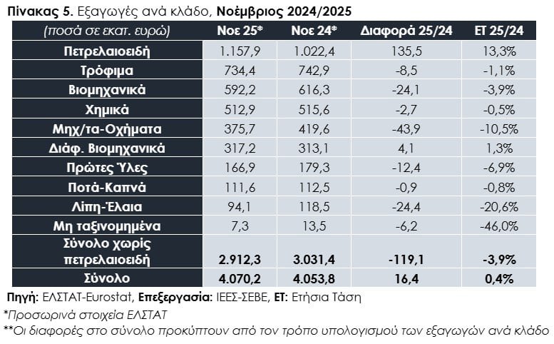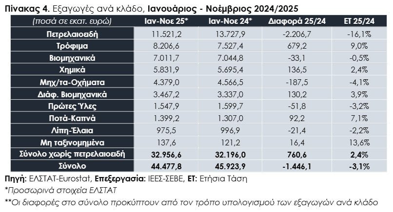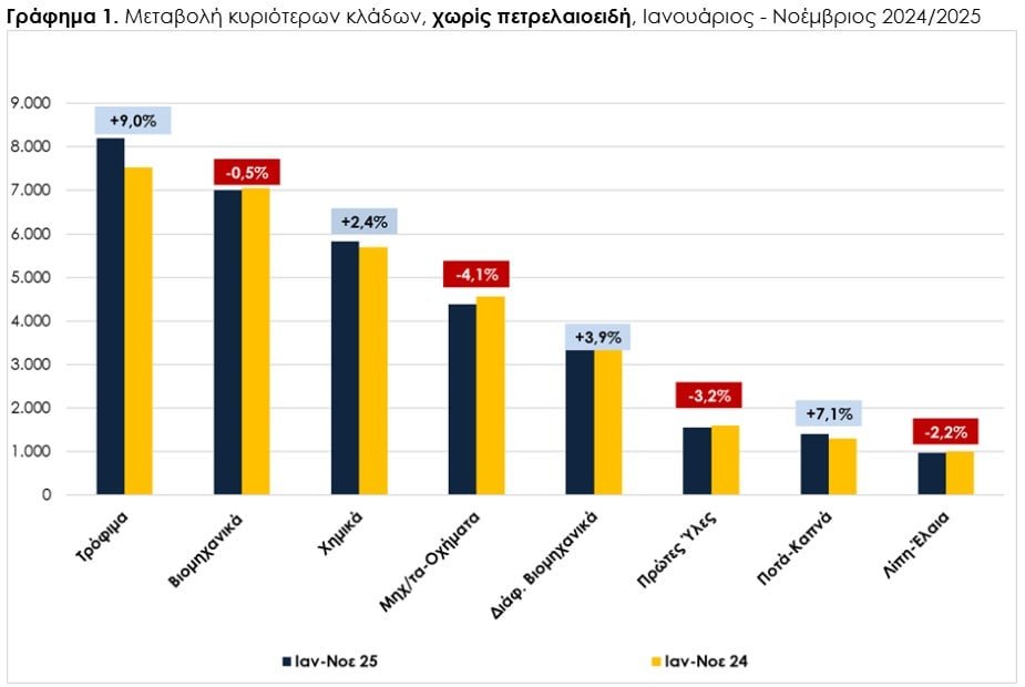 Αντιθέτως, ο κλάδος των πετρελαιοειδών παρουσίασε τη μεγαλύτερη μείωση, τόσο σε απόλυτους όσο και σε ποσοστιαίους όρους, σημειώνοντας «βουτιά» 2,207 δισ. ευρώ ή 16,1%, επηρεάζοντας καθοριστικά τη συνολική πορεία των εξαγωγών. Πτωτικά κινήθηκαν επίσης τα μηχανήματα–οχήματα, με μείωση 187,5 εκατ. ευρώ ή 4,1%, καθώς και οι πρώτες ύλες (-51,8 εκατ. ευρώ, -3,2%). Μικρότερη υποχώρηση καταγράφηκε στα βιομηχανικά προϊόντα (-33,1 εκατ. ευρώ, -0,5%) και στα λίπη–έλαια (-21,4 εκατ. ευρώ, -2,2%).