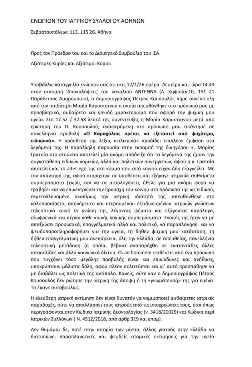Κατατέθηκε στον Ιατρικό Σύλλογο η καταγγελία του Νίκου Καραχάλιου κατά της Μαρίας Καρυστιανού, κίνηση που είχε προαναγγείλει μιλώντας στον Realfm 97,8 το μεσημέρι της Κυριακής.