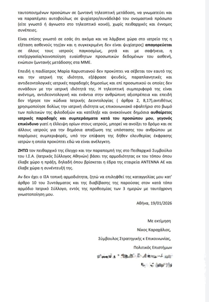 Νίκος Καραχάλιος: Κατατέθηκε η καταγγελία του κατά της Μαρίας Καρυστιανού στον Ιατρικό Σύλλογο – «Ζητώ τον πειθαρχικό της έλεγχο»