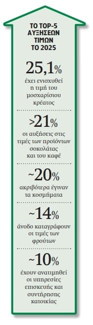 Στην κορυφή των αυξήσεων του 2025 βρίσκονται βασικά τρόφιμα. Το μοσχάρι καταγράφει τη μεγαλύτερη ετήσια μεταβολή, με άνοδο 25,1% μέσα σε λιγότερο από έναν χρόνο, επιβαρύνοντας περαιτέρω το ήδη αυξημένο κόστος κρέατος. Ακολουθούν τα προϊόντα σοκολάτας και ο καφές με αυξήσεις άνω του 21%, εξέλιξη που συνδέεται τόσο με τις διεθνείς τιμές πρώτων υλών (κακάο, καφές) όσο και με το κόστος ενέργειας και μεταφορών.
