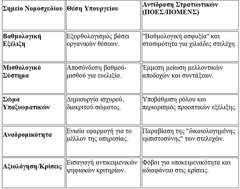 Καθήλωση Βαθμών: Υποστηρίζουν ότι το νέο σύστημα οδηγεί σε «βαθμολογική ασφυξία», καθώς χιλιάδες στελέχη (κυρίως υπαξιωματικοί) κινδυνεύουν να παραμείνουν στον ίδιο βαθμό για πολλά χρόνια, χάνοντας τη δυνατότητα εξέλιξης που είχαν με το προηγούμενο καθεστώς.