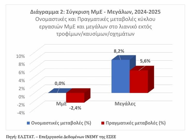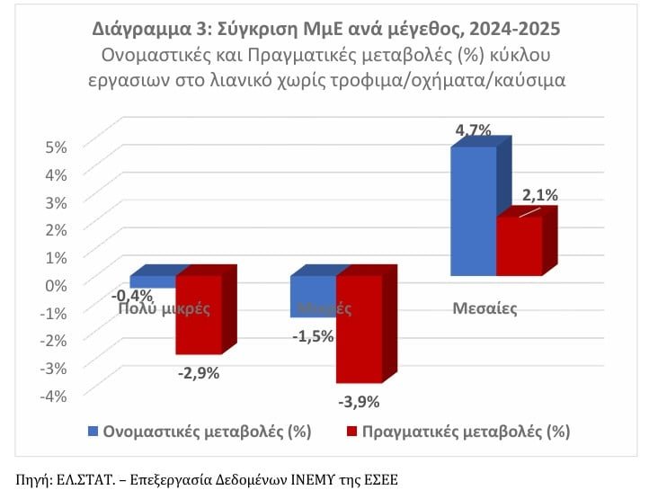 Όπως προκύπτει από τα στοιχεία της ανάλυσης, το 2025, οι μεγάλες επιχειρήσεις κατέγραψαν σημαντική ενίσχυση των πραγματικών τους πωλήσεών κατά 5,6% [+8,2%] (Διάγραμμα 2). Αντίθετα, για το σύνολο των ΜμΕ στο λιανικό, ο κύκλος εργασιών, σε διορθωμένες ως προς τον πληθωρισμό τιμές, εμφάνισε σημαντική πτώση κατά 2,4% [0,0%].