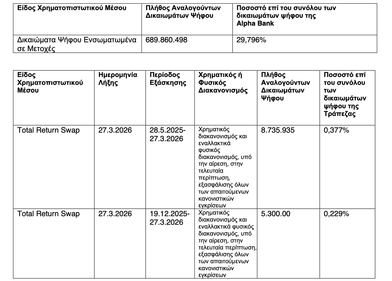Στην εξάσκηση χρηματοοικονομικών προϊόντων, τα οποία οδήγησαν στην άμεση απόκτηση 689.860.498 κοινών μετοχών με δικαίωμα ψήφου, που αντιστοιχούν σε ποσοστό 29,796 % επί του συνόλου δικαιωμάτων της Alpha Bank, προχώρησε η UniCredit.