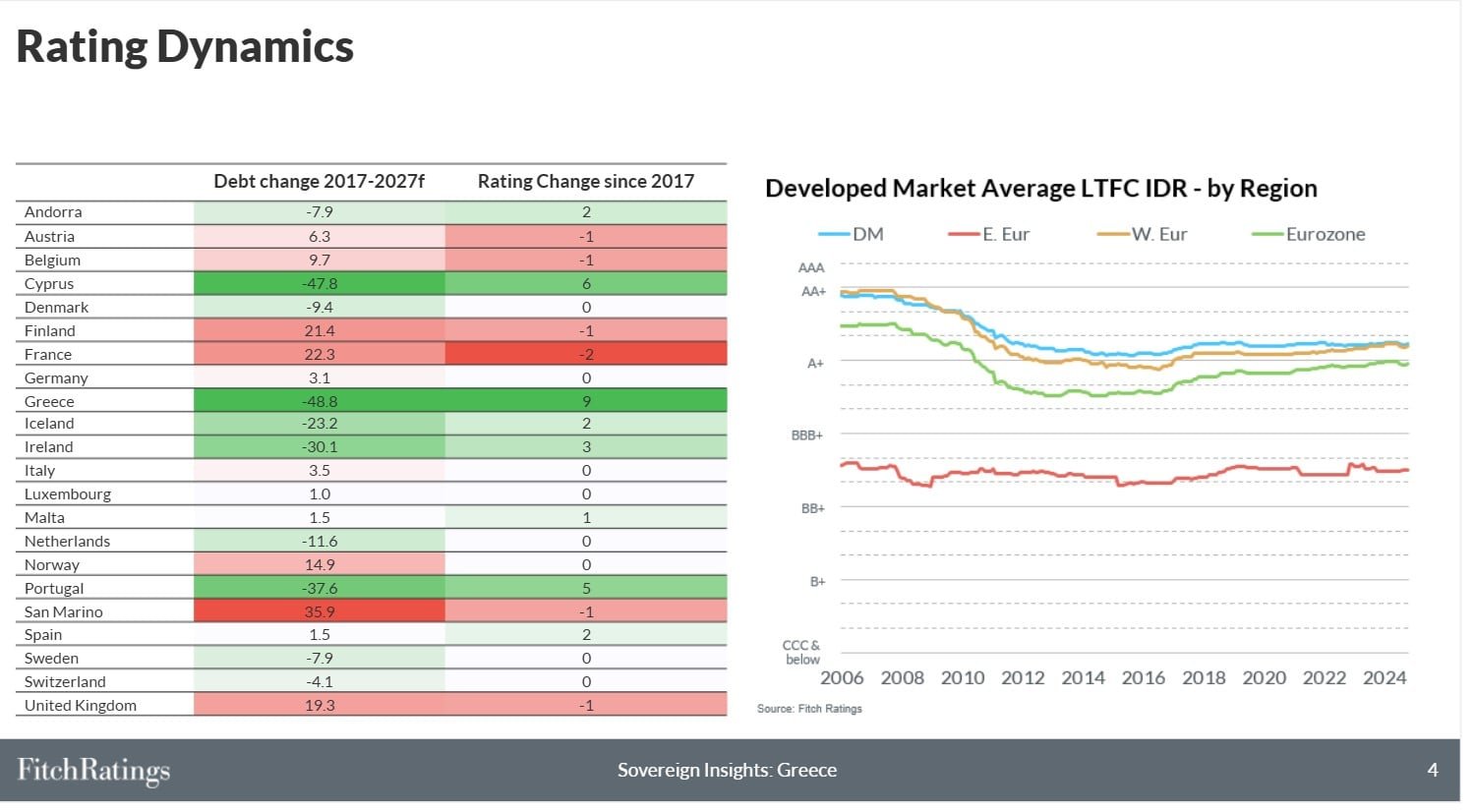 στη σταθερή μείωση του χρέους και στην ανθεκτικότητα της οικονομίας. Στην κλίμακα αξιολόγησης του οίκου η Ελλάδα βρίσκεται λίγο χαμηλότερα από χώρες όπως η Ιταλία και η Βουλγαρία, που αξιολογούνται με BBB+.