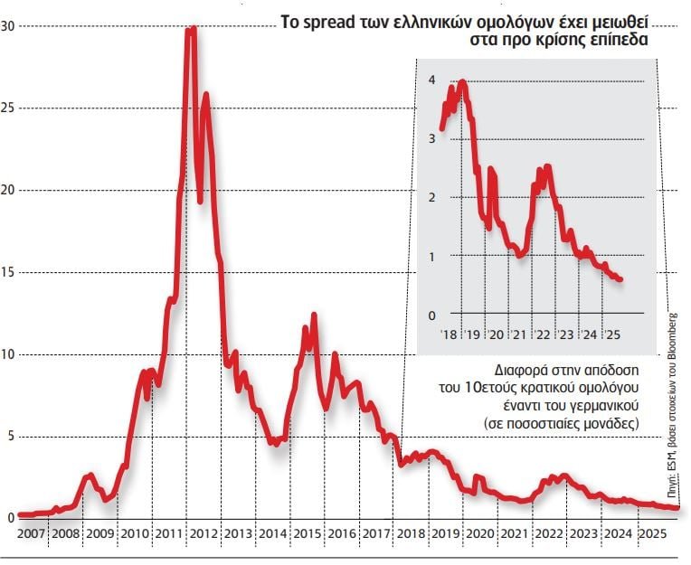Τον Μάιο του 2025, το ελληνικό κρατικό spread (η διαφορά απόδοσης του 10ετούς ομολόγου σε σχέση με το γερμανικό Bund – το κρατικό ομόλογο αναφοράς της Ευρωζώνης) υποχώρησε κάτω από τις 80 μονάδες βάσης (μ.β.) για πρώτη φορά από το 2007.